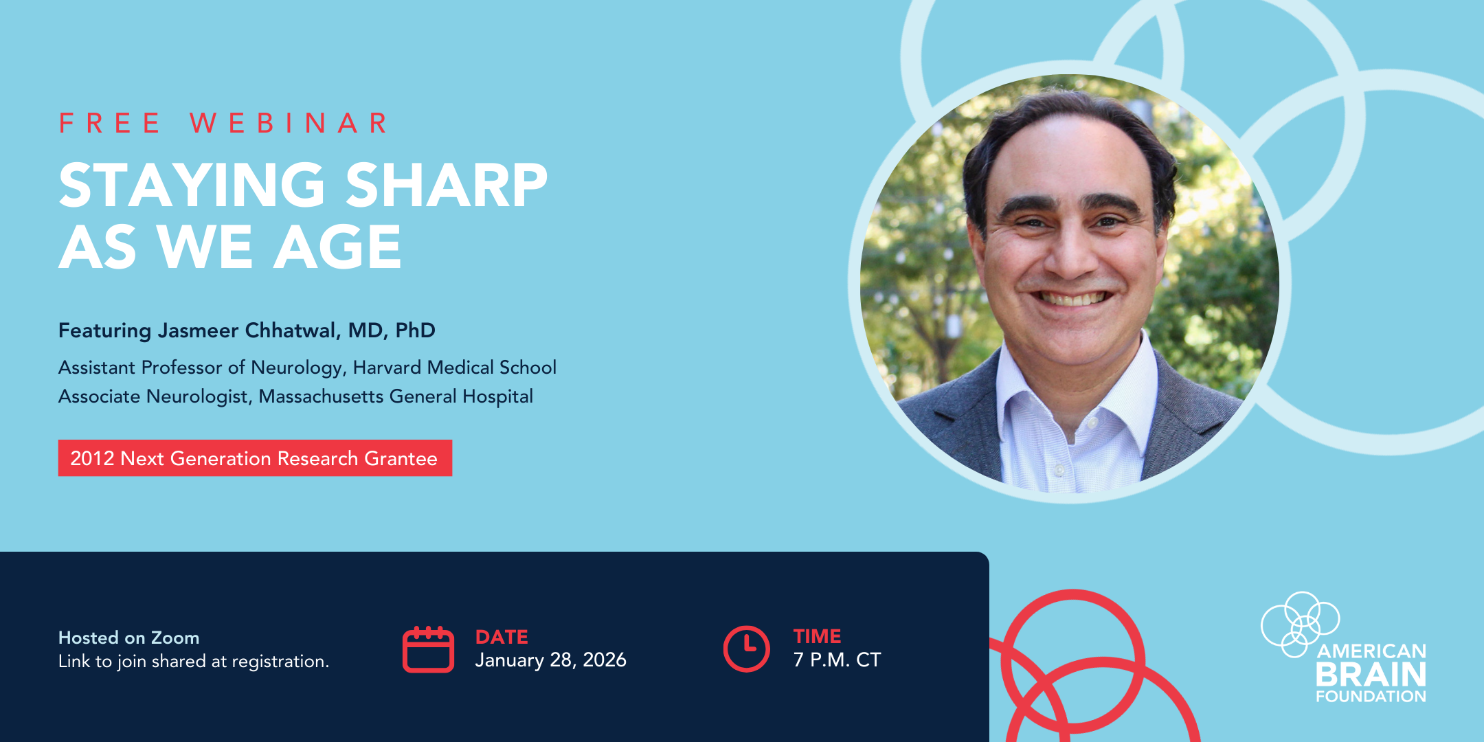 Join Jasmeer Chhatwal, MD, PhD—Associate Professor of Neurology at Harvard Medical School, practicing neurologist at Massachusetts General Hospital and Brigham and Women’s Hospitals, and 2012 American Brain Foundation Next Generation Research Grant Recipient—for science-backed tips on keeping your brain healthy as you age.